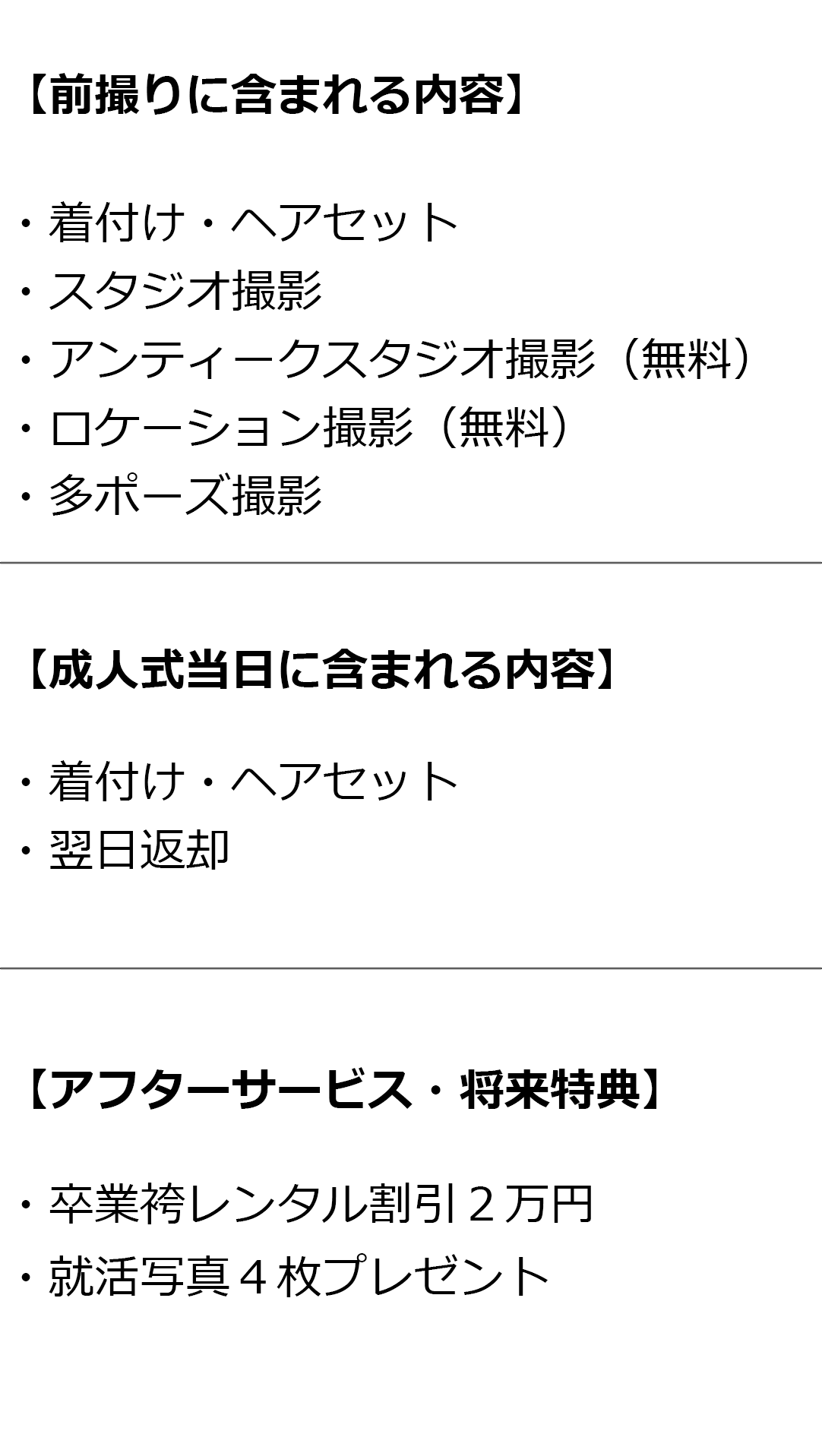 | 振袖レンタル | 110,000円~衣装により変動 |