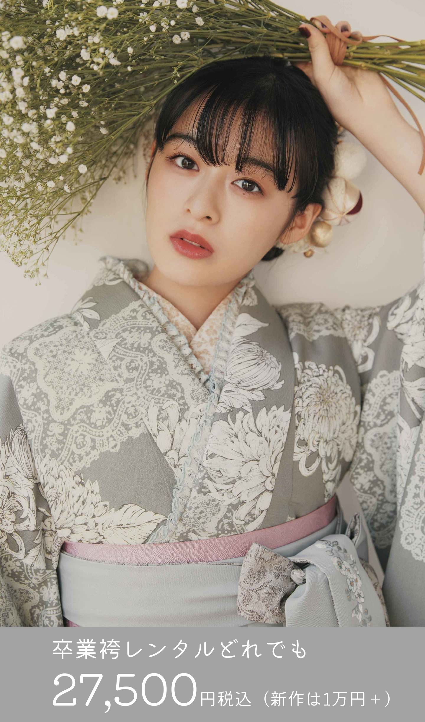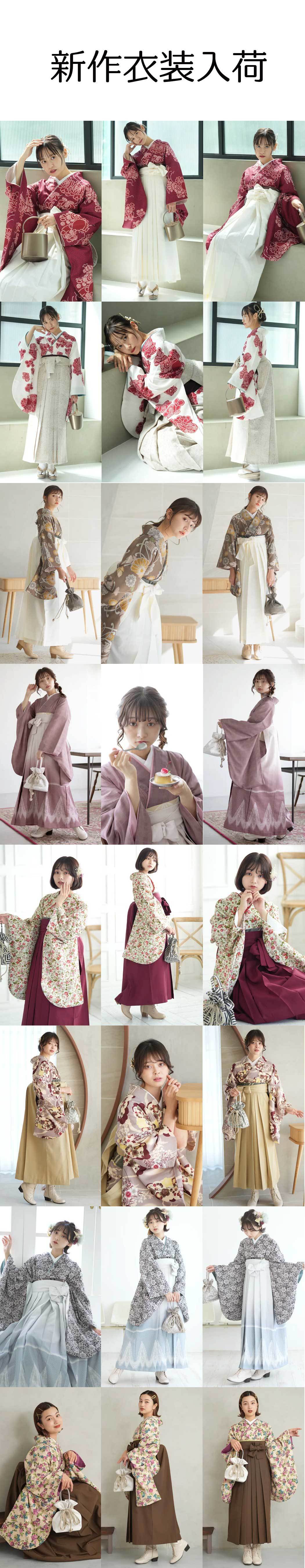 2尺袖着物、袴、帯、肌着足袋、草履、巾着がセット料金に全て含まれています。新作は+1万円です。遠方のお持ち出しの為、レンタル期間は1週間に延長されます。